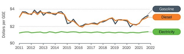 For fleet operators, there's a lot to like about electric vehicles (EVs). Aside from the obvious benefits of eliminating carbon emissions and reducing demand for fossil fuels, EVs also cost significantly less to operate than gas- or even diesel-powered vehicles. In fact, according to the US Dept of Energy, light-duty EVs only cost about three cents per mile to operate. Plus, as you can see in the chart below, electricity costs much less than both gasoline and diesel, and the cost of electricity per gasoline gallon equivalent (GGE) remains far more stable than gas or diesel — meaning you'll not only spend less in fuel costs with EVs, you're also much less likely to be shocked by a sudden surge in fuel prices.